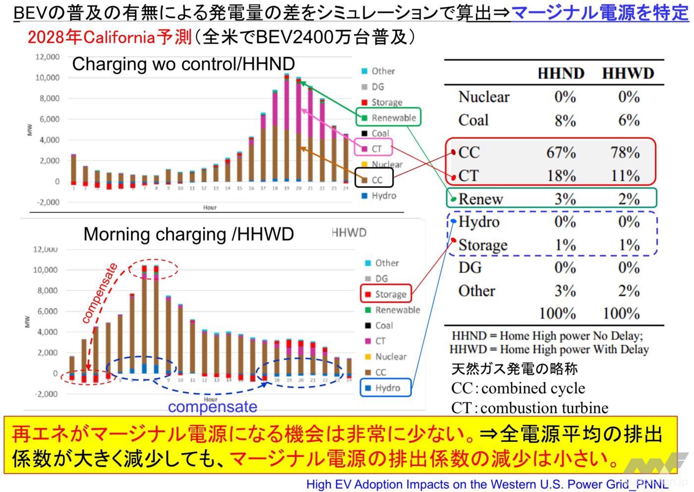 2023年の京都のP, E&L国際会議では、エンジンの3D-CFDの研究者であるCONVERGE社のDr. Kelly SenecalがシミュレーションでBEVとHEVのCO2排出量を米国の州毎に比較している。その中でマージナル電源の排出係数について図1-7のように説明している。図1-4のPaul Milesの説明と似ているが、実測ではなくシミュレーションで計算した結果を示しているので、その意味をより理解しやすい。