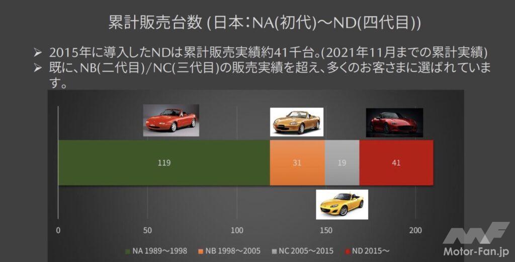初代NAロードスターの大ヒットぶりがここからもわかるが、「NAへの回帰」を志向したNDロードスターがヒットしていることも見てとれる。
