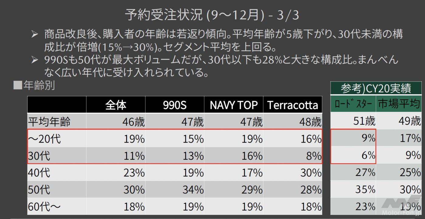 齋藤さん じつは30代以下の若い世代の構成費が倍になったんです。昨年までは20~30代で15%くらいしかいらっしゃらなくて、やっぱりロードスターはおじさんの乗り物っていう感じになってたんですけども。この商品改良で20~30代が30%に倍増しました。きっかけは言うまでもなく、990Sだと思います。軽井沢でお披露目したあたりからものすごく受注が増えてきています。若い方にもこのライトウェイトらしさっていうのが響いているんだと思います。