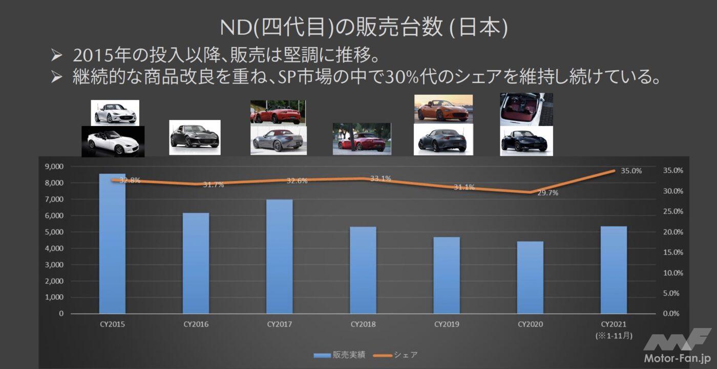 初代NAロードスターの大ヒットぶりがここからもわかるが、「NAへの回帰」を志向したNDロードスターがヒットしていることも見てとれる。