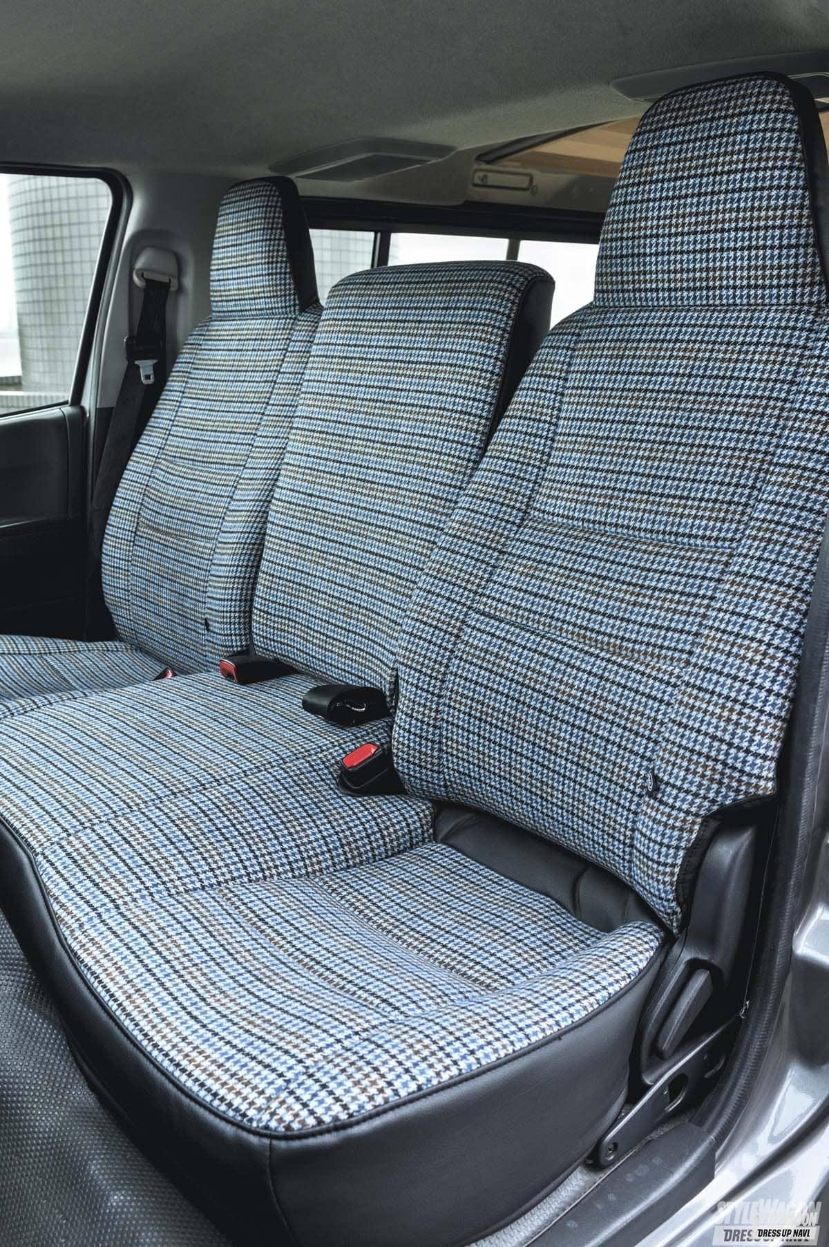 1&2列目に装着するオリジナルシートカバーは、味わい深い千鳥格子柄だ。色使いにも配慮した全3色から選べる。