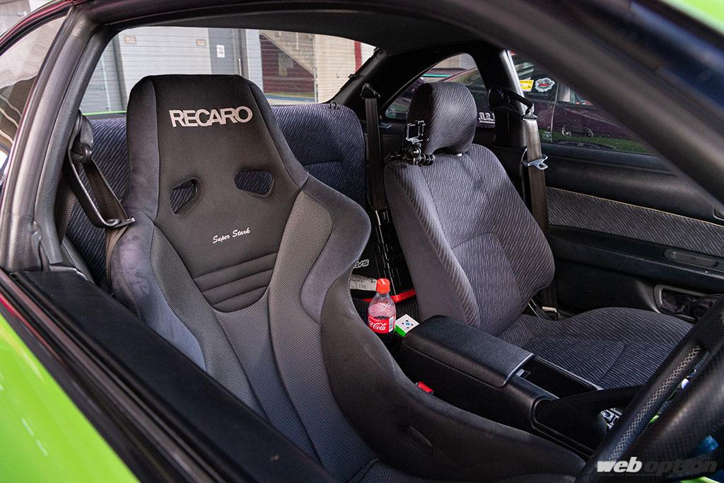 室内は運転席にレカロのフルバケットシート“RS-G”がセットされている程度。通勤に使用する足グルマということで、あくまでも実用性を重視しているのだ。