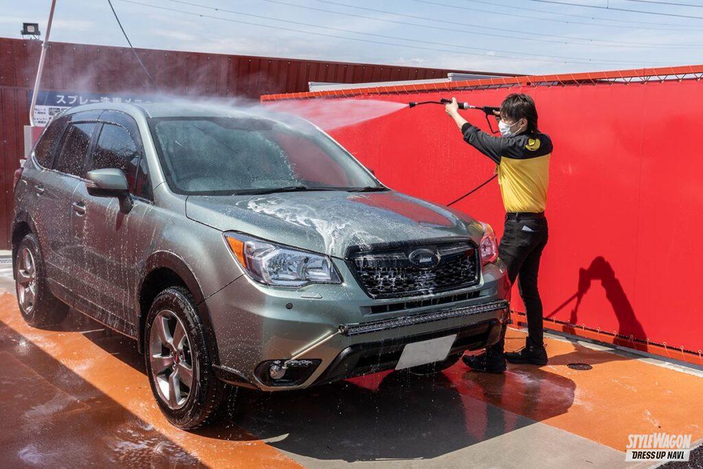 いきなりシャンプーなどで洗車をはじめると、ボディに付着しているホコリなどで傷をつけてしまう可能性もあるので、まずは水洗いで汚れを落としていく。洗車場などにある高圧洗浄などが効果的で好ましい。順番としては、一番汚れている部分から洗浄するのが◎。