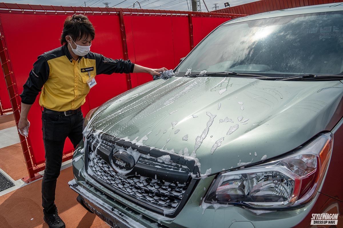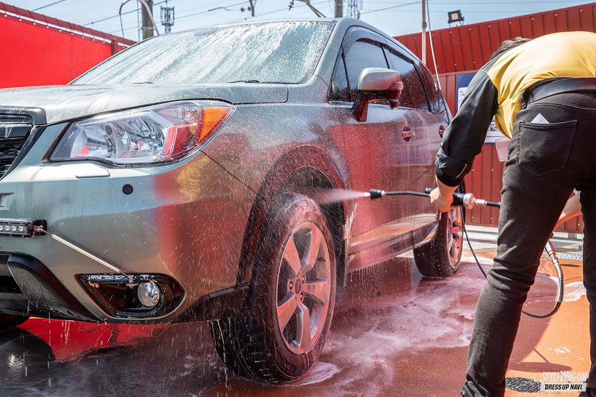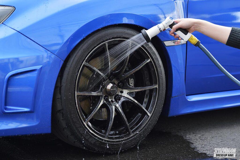 いきなりシャンプーなどで洗車をはじめると、ボディに付着しているホコリなどで傷をつけてしまう可能性もあるので、まずは水洗いで汚れを落としていく。洗車場などにある高圧洗浄などが効果的で好ましい。順番としては、一番汚れている部分から洗浄するのが◎。