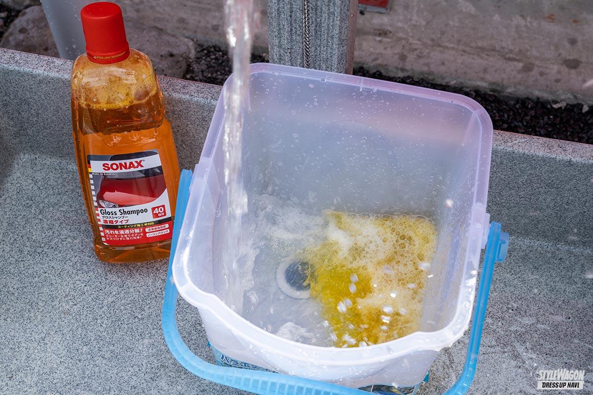 用意したバケツにシャンプーを入れて、使用するシャンプーメーカーが推奨する水量で希釈する。よく泡立てた洗浄液をスポンジに染みこませ撫でるように洗う。日が一番当たるルーフは最後に、フロントまわり→サイドと洗う場所をわけながら洗っていくのがポイント。