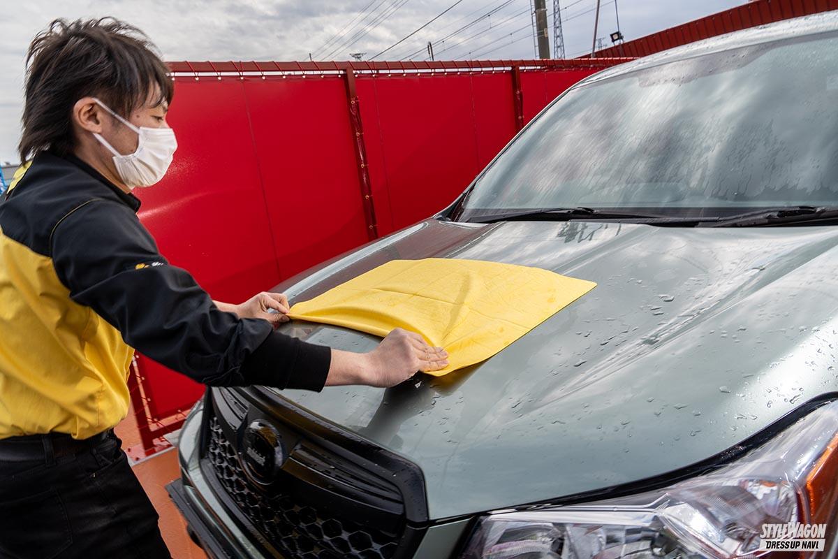 最後の拭き上げ作業の重要なポイントは、水滴が乾く前に拭き上げるということ。水滴が残ってしまうと、水アカの原因になったり、再度汚れが付着しやすくなる。拭き上げの際は、なるべく擦らずに吸水性能に優れたクロスを広げて広範囲に拭き上げるのがポイント。