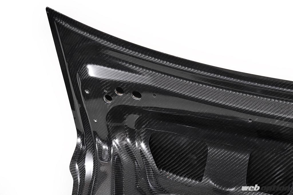 空力パーツのインストールを想定した設計となっている点も見逃せない。製品は内部にハニカムを組み込んだ上で、GTウイングの土台となる部分の炭素繊維を7層構造(他の部分は5層)化。純正を遥かに上回る強度を手にしているのだ。