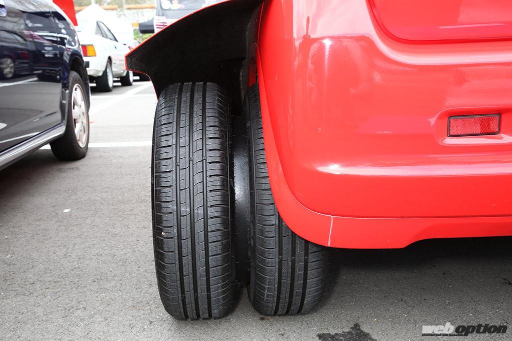 さらに見逃せないのが、リヤのダブルタイヤ仕様。2つの鉄チンホイールを溶接合体してリムサイズを倍にしているのだが、インパクトがハンパじゃない! 部材として馬の蹄鉄を使っているのがチャームポイントとのこと。