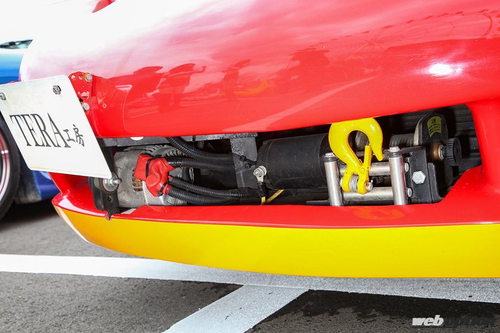 破天荒メイキングはまだ続く。カスタムオーディオの音圧を稼ぐには電力が必要だと、オルタネーターを3基掛けしているのだ。追加した2つのオルタネーターはバンパー内に押し込んでおり、その横にはなぜかウインチまで追加されていた。