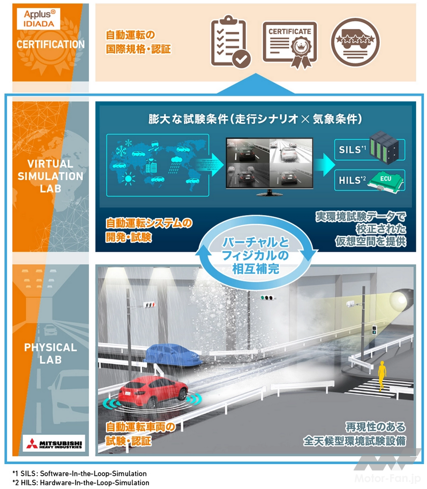 自動運転システムは、世界的に精力的な開発が進み、今後飛躍的な能力向上と普及が見込まれているが、その安全・安心を保証するためには、自動運転車両が直面する多様な自然環境下においてセンサーやシステムが正常に機能することを検証する必要があり、今後、全天候型環境試験に対するニーズが高まることが見込まれる。これを受け、三菱重工グループ3社は、任意の自然環境(雪、霧、雨、光など)と走行状況の組み合わせを自由に生成して自動運転システムを高精度に試験できる屋内型の統合環境試験装置と、仮想環境下における網羅的検証が可能なシステムをIDIADA社と共同で開発する。これにより、自動車OEMやセンサーメーカーによる自動運転システム開発期間の短縮および開発費用の低減に寄与することを目指す。