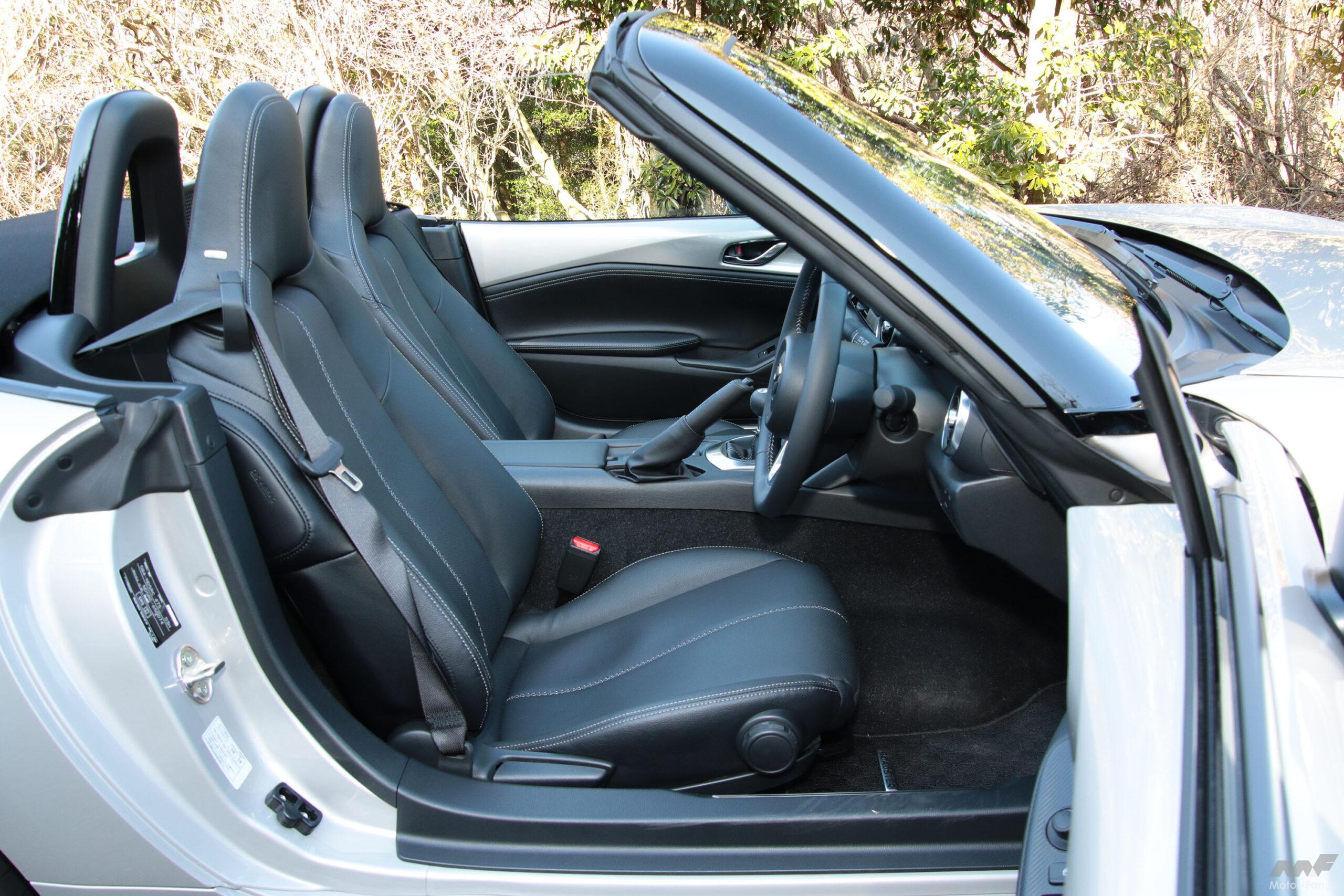 続いて試乗したのは、132psと152Nmを発する1.5L直4NAエンジンを搭載するソフトトップ車の中間グレード「Sレザーパッケージ」6速MT車。前後スタビライザーとLSD、本革シートを標準装備する。なお、レイズ製16インチ鍛造アルミホイールやブレンボ製フロントブレーキキャリパー&前後大径ローターがオプション設定されているが、テスト車両には装着されていなかった。