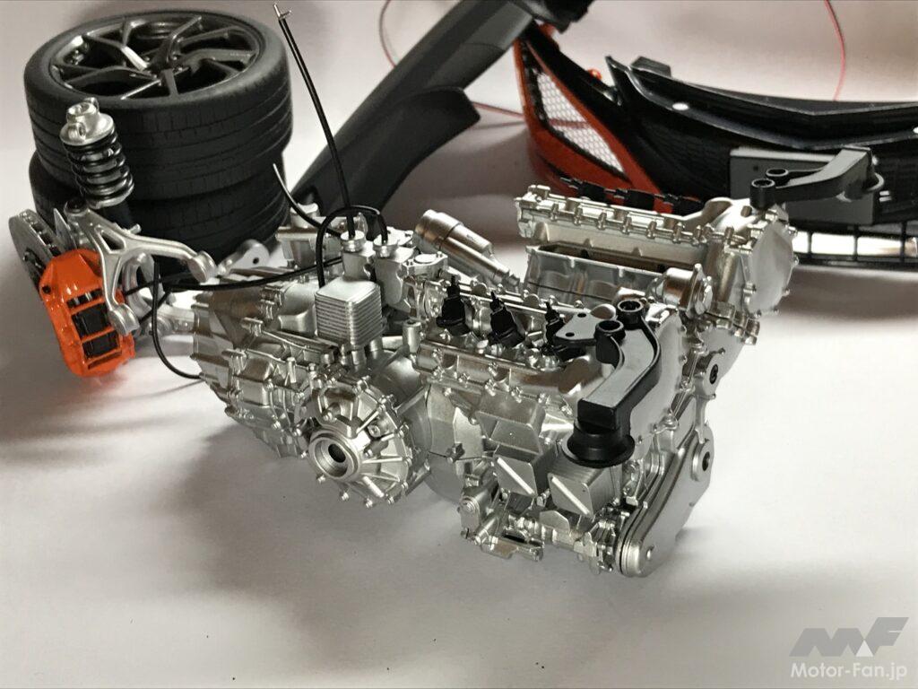 今回はまずエンジンホルダーアームの装着です。つまりエンジンマウントですね。シリンダーヘッドのフロント側にアームを装着します(本物のNSXにこんなマウントが装着されているのかは、ちょっと不明)。シリンダーは金属製なので、電動ドライバーを使って装着します。さらにトランスミッションの横の丸い部分にカバーを装着します、説明書にはカムシャフトカバー書いてありますが、どう考えてもこれはドライブシャフト部分のカバーですね。これを向きを合わせてはめ込んだら今回の作業は完了、なのですが、エンジンホルダーアームを固定したビスの頭の塗装がちょっと剥げてしまったので、フラットブラックで塗装。エンジンの全景はほぼ完成しているのですが、ハイブリッドのために補機類やホースなどが多いようで、エンジンの最終完成までにはもうちょっとかかりそうです。