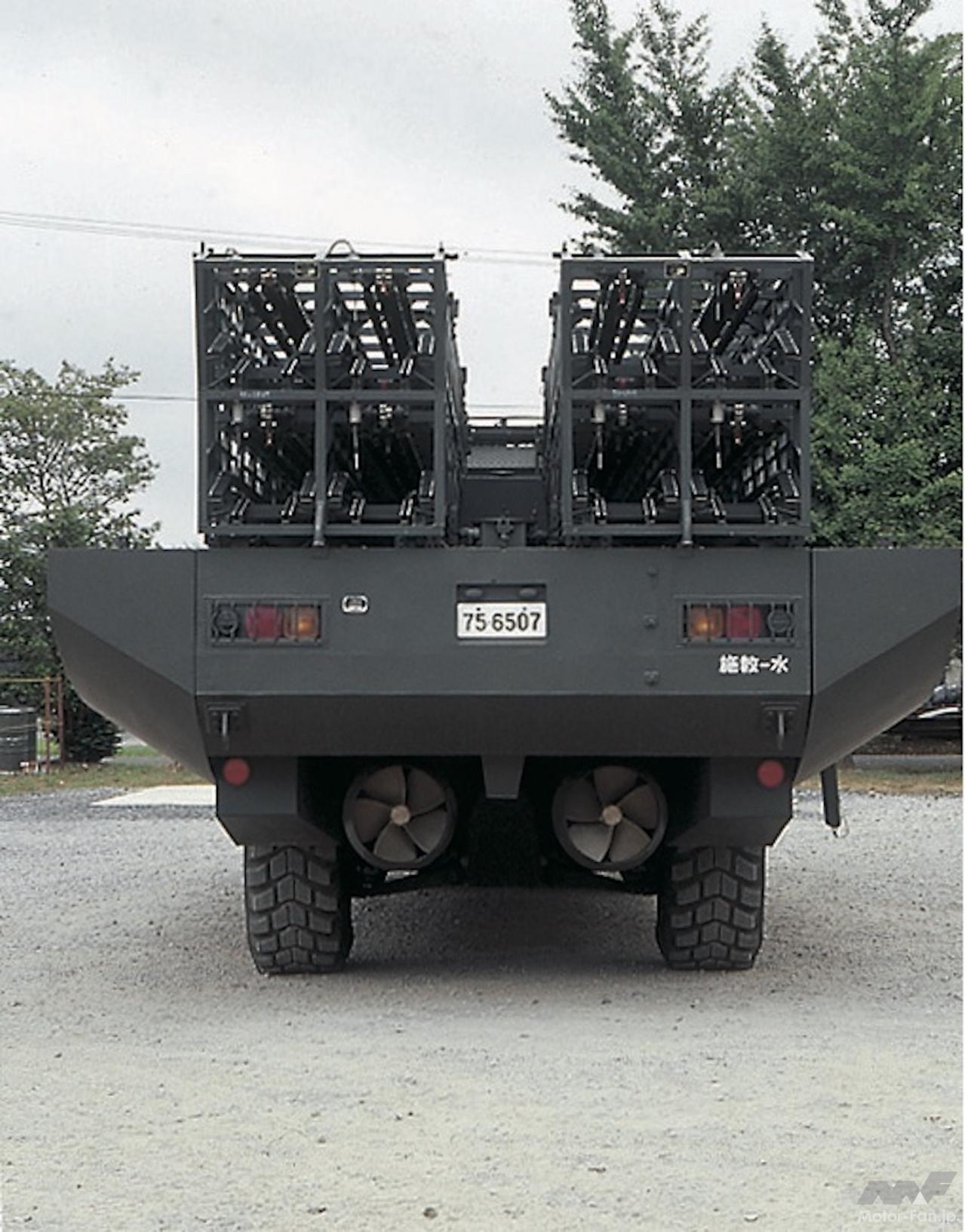 94式水際地雷敷設装置(すいさいじらいふせつそうち)は、着上陸しようとする敵の上陸用舟艇などを破壊、上陸行動を阻止するための水際地雷(水底や水中に設置する地雷)を敷設する機能を持った装備だ。本装備は、水中地雷を設置するための敷設装置と、装置を搭載する水陸両用車から成る。名称どおり、水陸両用車が背負った装置から水中に地雷を撒くメカなのである。ちなみに本装備は当初、車両であり船舶でもあると法定されていた。だから操縦者は車両と船舶両方の免許が必要だったが、近年、自衛隊法改正での適用除外を受けている。ただ、操縦者は部内の特技教育を受けて水陸両用車を操縦することに変わりはなく、装備も船舶登録による船名や喫水線の表示、浮き輪など安全・救命備品の搭載、錨など船の機能設備の搭載などはそのままだ。