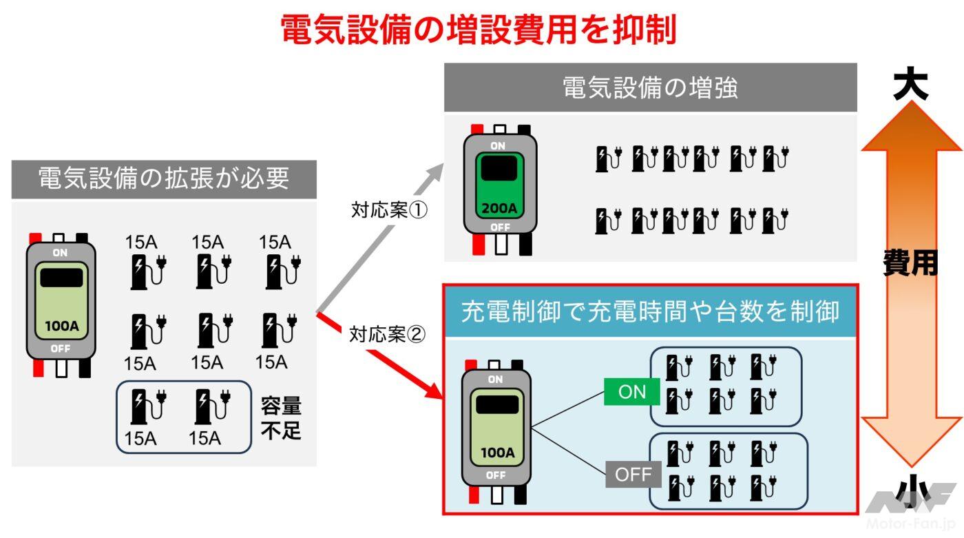 同時に充電する台数を制御することで、既設のブレーカー容量でもできる限り多くの充電器を同時に運用することが可能となる。
