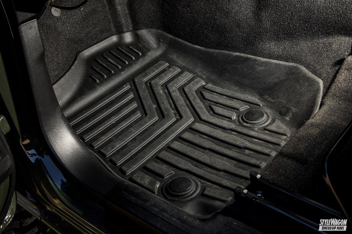 シルバーボディのJB74に装着されていないパーツでは、トリチューブLEDDテールランプやホワイトとイエローの切り替えができるLEDフォグランプなど光ものも充実。内装系は、JB74が黒木目調のパネルでまとめられていたのに対し、こちらはカーボン調とサテンシルバーのパネル(ガーニッシュ)アイテムを装備。泥や砂など汚れを気にせず乗り込める3D防水フロアマットは、アウトドア派にオススメのアイテムだ。