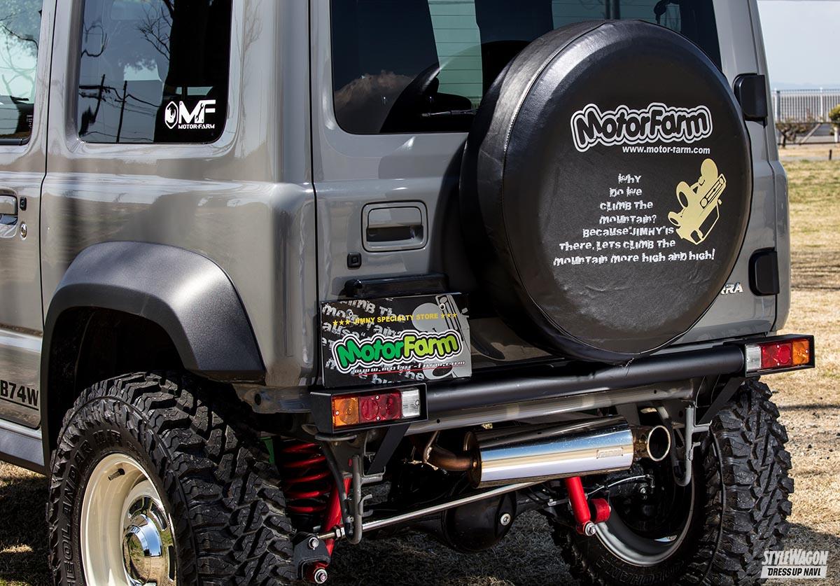 足まわりから内外装まで、非常に豊富なパーツラインアップでジムニーのカスタムをサポートしてくれるのがモーターファーム。シルバーボディのJB74シエラは、2インチアップの足まわりに245/75R16のM/Tタイヤ、スチールバータイプのバンパーなどを組み合わせたクロカンテイスト強めのエクステリアが特徴。ただ先代や先々代ジムニーに比べると現行ジムニーは、キャンプやアウトドア人気の影響もあって、純粋にオフロードやクロカンを攻めるオーナーよりも、アウトドアやキャンプに似合うクルマとして女性にも人気が高い。ジムニースペシャリストであるモーターファームだけに、当然ながらそのあたりも意識したカスタムを展開している。