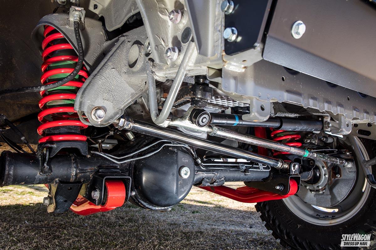 もちろん足まわりや駆動系は「悪路も任せなさい」の本気の仕様。30㎜アップコイルスプリングに調整式ロングショックアブソーバー、前後アームなどを装着。フロントのリーディングアームは2インチ用の20㎜ロングタイプで、オフロードでアーム取り付け部を保護するピボットガードも用意されている。また2インチ以上のリフトアップ時に、プロペラシャフトがクロスメンバーに干渉する問題を解消するためのダウンサポートメンバーも装着(フロントショックの最大長475㎜以下に適合)。悪路での走破性を高めるリア用のデフロックは、エアーで作動する「ファームロッカー」を装備するなど、サスペンションや駆動系は、シルバーボディのJB74同様にハイレベルな仕上がりとなっている。