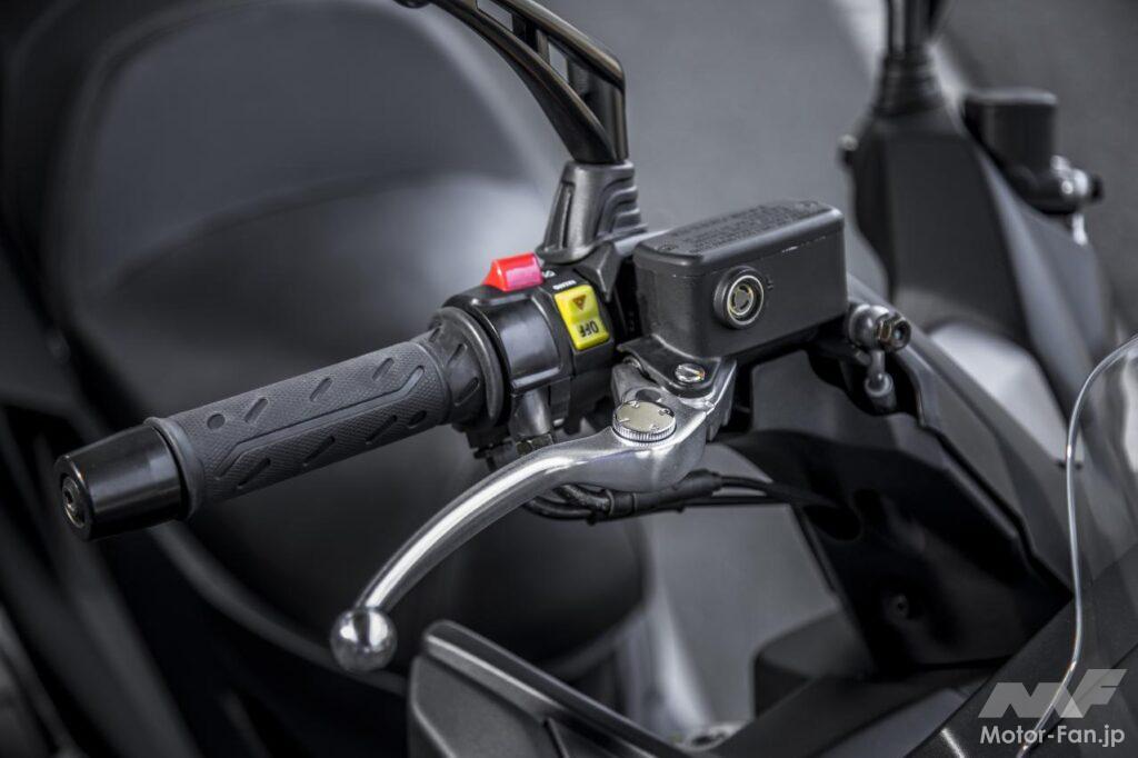 さて、日常的に使う原付二種スクーターなので、装備についても言及したい。私が特に気に入ったのは左右のブレーキレバーの調整機構で、250ccのスクーターでもこれが装備されることは稀だ。また、ハンドル中央のUSBソケットだけでなく、シート下のラゲッジスペースにもシガーソケットを装備するなど、電力供給はほぼ完璧。さらに、そのラゲッジスペースに照明を設ける(PCXにはない)など、装備面についてもさすが抜かりない。