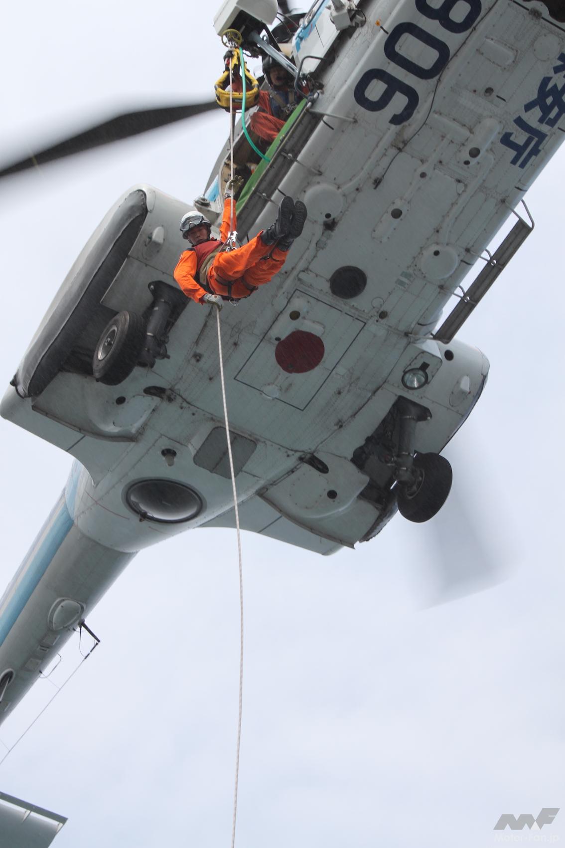 業界人コラム 陸上自衛隊:ヘリコプターの能力を見る①、「ヘリボーン」地上部隊を空輸し素早い展開を行なう【写真・1枚目】 陸上自衛隊の多用途ヘリUH-1J。第1空挺団の訓練展示での様子。後方から進入して急速降下、地上へ激しくタッチダウンし、一転急上昇に移る瞬間。ヘリボーン作戦の主力が見せたハデな機動に見学者からは驚嘆の声が起きた。 第1空挺団は落下傘降下に加えてヘリを使った空中機動(ヘリボーン作戦)により立体的な戦術を駆使する。多用途ヘリUH-1のスキッド(ソリ)に乗った狙撃手チームを前線へ投入し降下本隊をカバーする状況。 輸送ヘリCH-47JAからファストロープ降下する空挺団。ヘリボーン作戦は短時間に兵力を増強する手段だ。 後方から高機動車と120mm迫撃砲を運ぶ。マンパワーに加えて火力も一気に投入、増強できるのがヘリボーンの利点。 消火訓練の様子。海水を満たした大型バケツ(バンビバケット)を海中から引き上げる陸自第15旅団第15ヘリコプター隊のCH-47JA。満水時のバケット重量は約5トンだが、パワフルなCH-47JAは余裕で吊り上げられる。 ヘリからリペリング降下する海上保安庁特殊救難隊。特救隊は全国展開する救助のエキスパートチームだ。 リペリング降下開始直後の特殊救難隊員を機上室内から見たもの。眼下で航走中の巡視艇へ降着する降下訓練だ。降下隊員の腰のハーネスに接続され、胸前にある器具が部隊で専用開発した降下器。 巡視船搭載のヘリのホイスト(ウインチ)装置を使って傷病者を吊り上げ救助する巡視船の降下員を機上から写したもの。降下員は巡視船乗組員が所要の訓練を受けて配置される救助要員。写真/海上保安庁 この画像の記事を読む