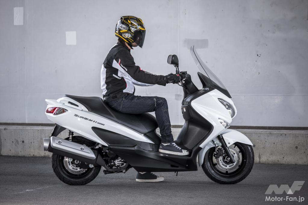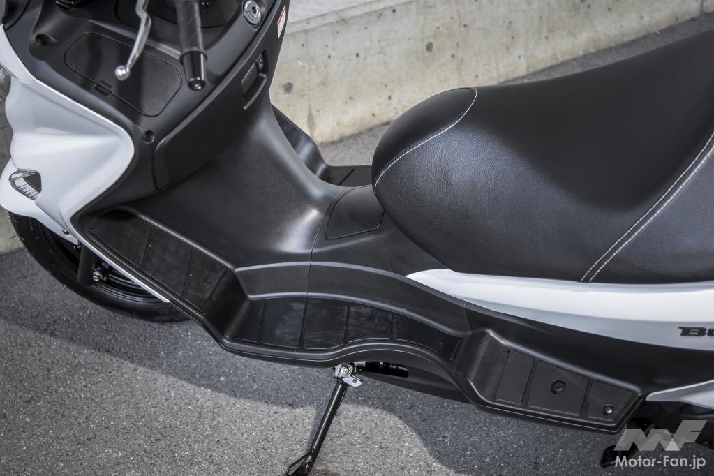 250ccスクーターに近い座面の広いシート。股下が絞り込まれ、足着き性を考慮した形状です。またパッセンジャーのためのグラブバーが大きく、2人乗りでのコンフォート性も追求していることがわかります。