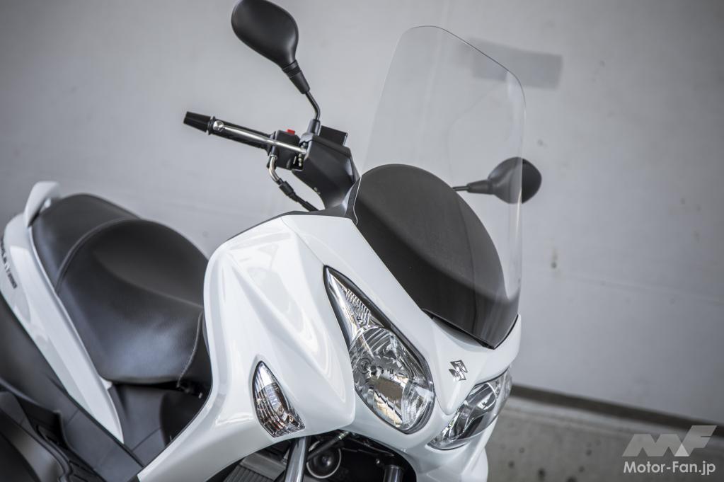 ロングタイプのウインドスクリーンは人間工学に基づき設計され、風洞実験から得た滑らかな曲面形状によって高い整流効果を発揮。スクリーン下部の通気ダクトは風の巻き込みを軽減します。また、ハンドルには樹脂製のカバーが与えられ、ラグジュアリーなムードとなっています。