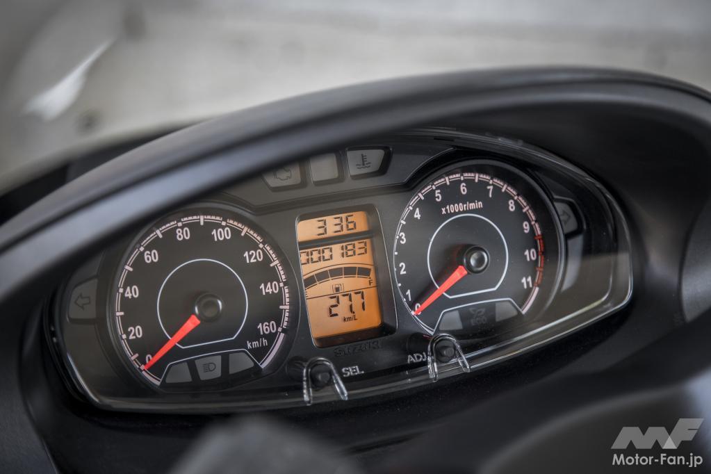 アナログ式のスピードメーターを左に、タコメーターが右に配置されたインストルメントパネル。中央のマルチファンクション液晶に時計、オド/トリップ、燃料計、燃費計などの情報を機能ごとにわけて表示しています。