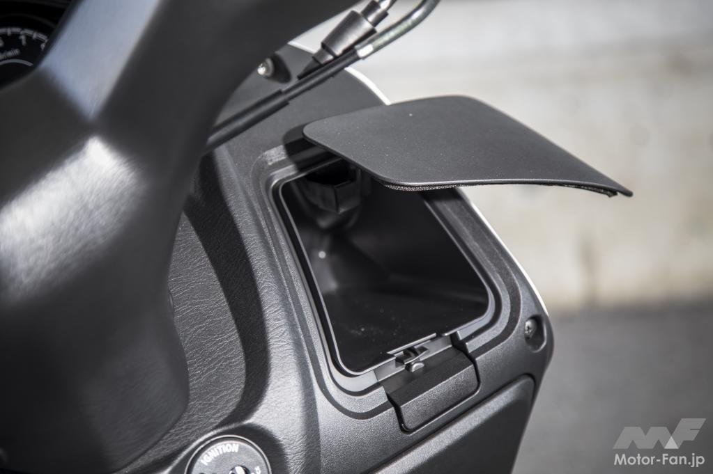 フロントパネルには2つのグローブボックスがあり、下段は広く容量6L、最大積載許容重量1.5kg。スマートフォンの充電などに重宝するアクセサリーソケット(DC12V)も左側に備わります。
