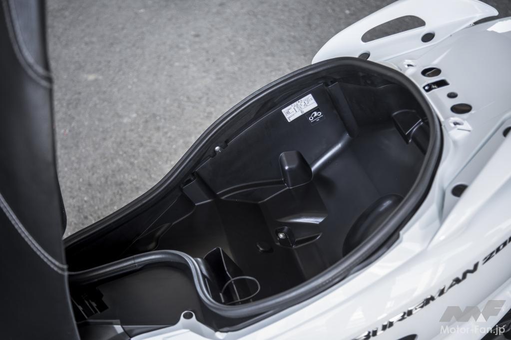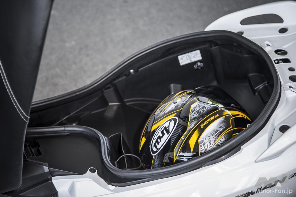 シート下のトランクスペースは、容量41L、最大積載許容重量3kgで、ヘルメット2個を収納できるキャパシティを確保しています。広く浅い形状で、ヘルメット2個を入れる場合は写真のように1つを横向きにするといいでしょう。