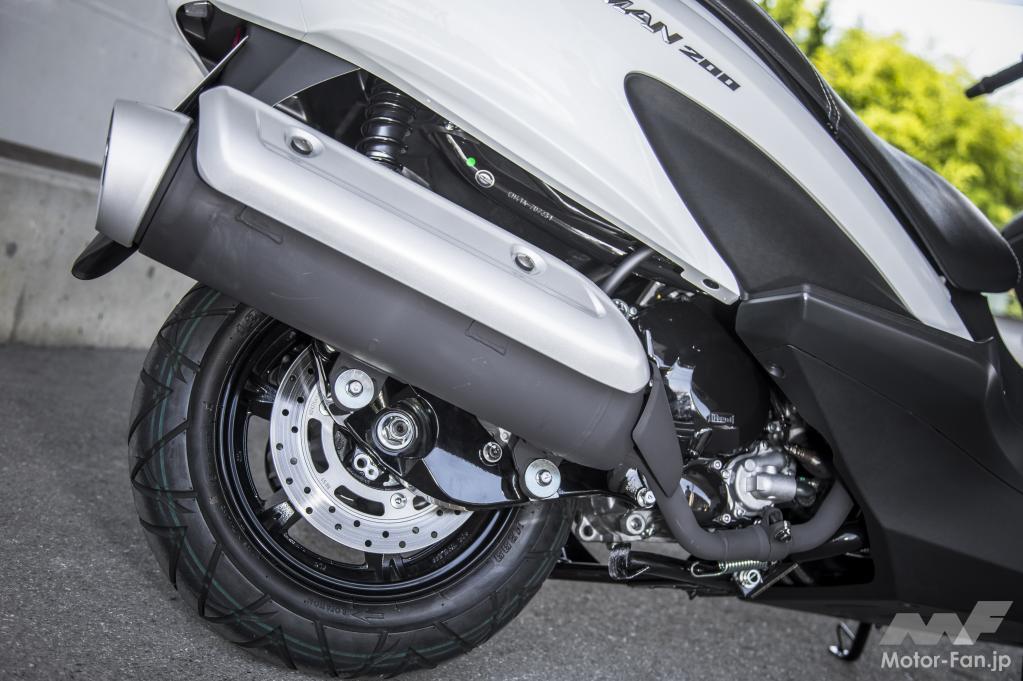 片押し1ポットキャリパーを用いたディスク式ブレーキをリアにも採用し、安定した制動力とコントロール性を実現。右側に大きなサイレンサーを配置し、迫力あるリヤまわりを演出しています。