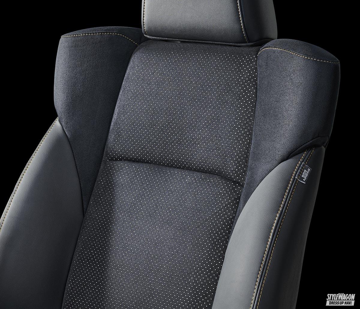 室内は共通でメーターリング、インパネ中央、シフトノブなどにゴールドをあしらう。シートはスェード調「ブランノーブⅡ」と合成皮革のコンビで、穴開き加工が施されてスポーティな雰囲気すら醸し出す。安全面ではブラインドスポットモニターとパーキングサポートブレーキも標準装備など充実している。