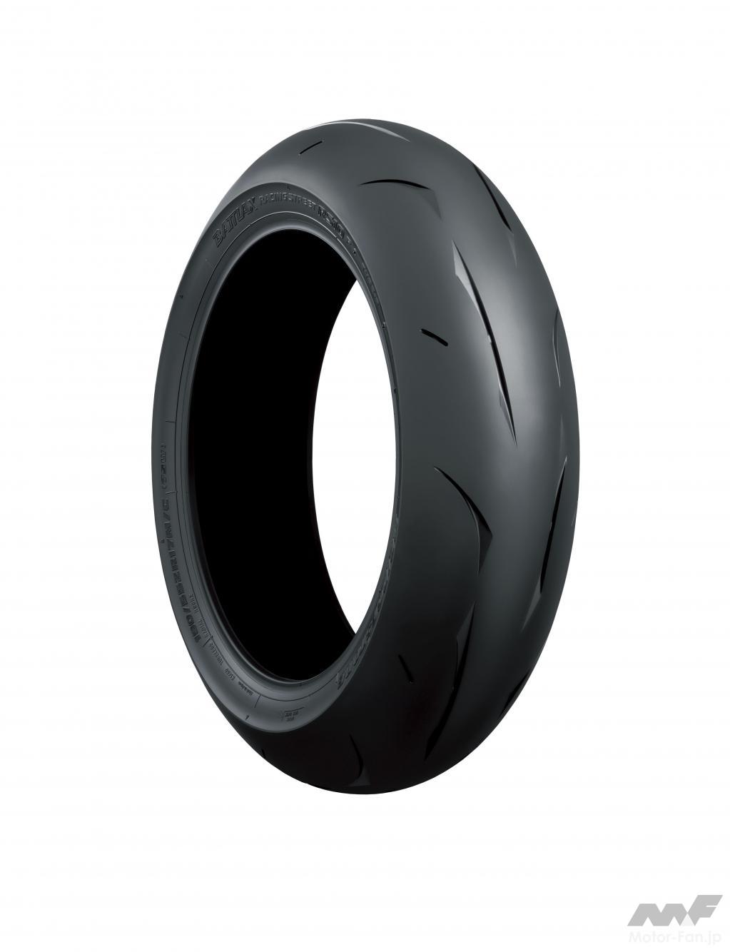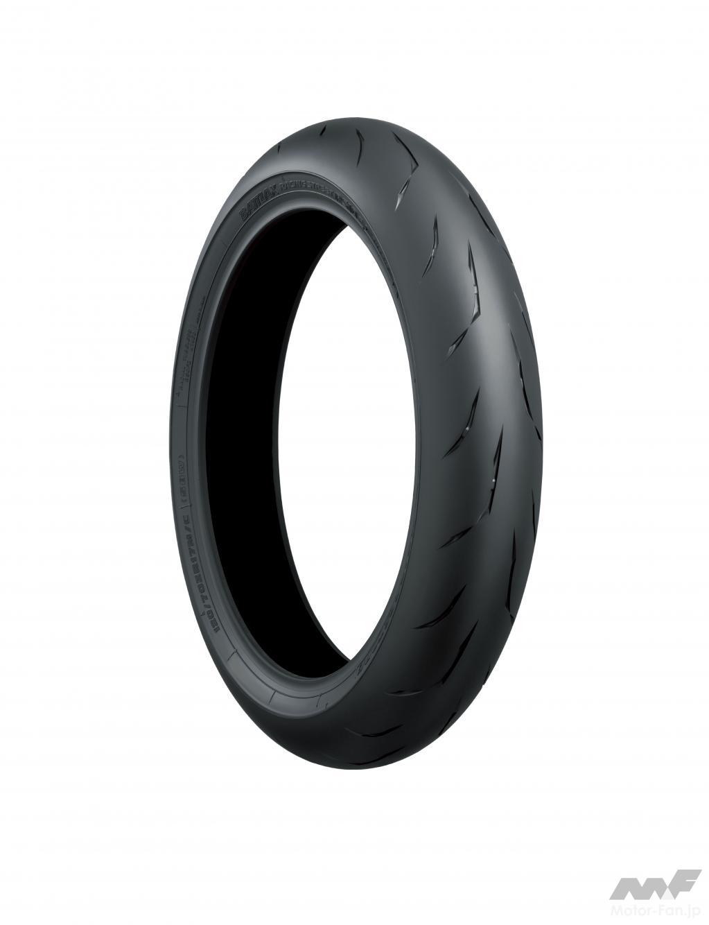 ブリヂストンのタイヤ「BATTLAX RACING STREET RS10」は19年式から「RS11」へ進化。よく見るとパターンが異なり、ショルダー付近にも溝が入ってウェット性能が上がっていることが一目瞭然です。