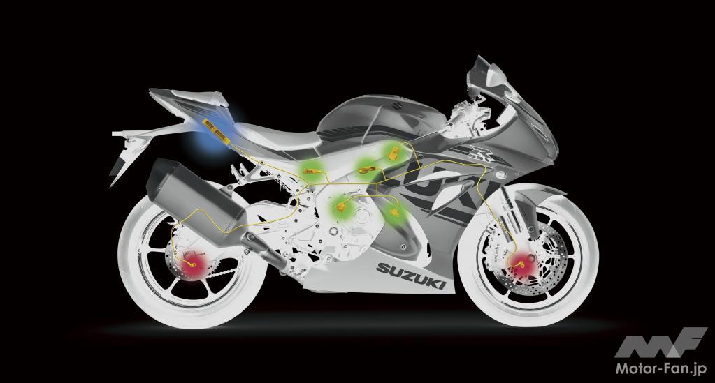2018年式と細部が微妙に異なり、ゴム製だったフロントのブレーキホースがステンメッシュにグレードアップしたほか、グラフィックの配置やリムストライプ色を変更。アンダーカウルは青でしたが、黒になっています。
