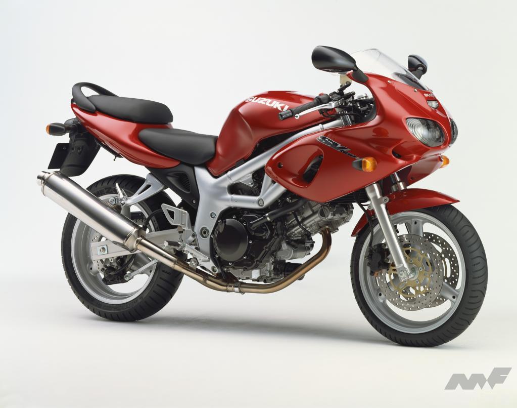 「TL1000S」のストリート向けバイクとしてエンジンをダウンサウンジングし、1998年に登場したのが“SV”です。欧州仕様は650ccエンジンを積み、国内向けには400ccを設定。スズキは初モノを手がけるのが昔から得意ですが、楕円断面アルミトラスフレームもクラス初で、贅沢なアルミ製スイングアームまで備えていたから驚きます。ハーフカウルを装着する“S”もありました。