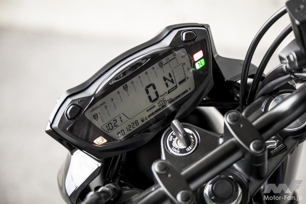 跨ってまず感じるのは、400オーバーのバイクとは思えない圧倒的なスリムさと足着き性の良さ。シート高785mmは「グラディウス650」と同じ値ですが、跨ぎ幅という点からフレーム幅が極限まで狭められ、同じシート高でも足着きの良さが一段と良くなっています。