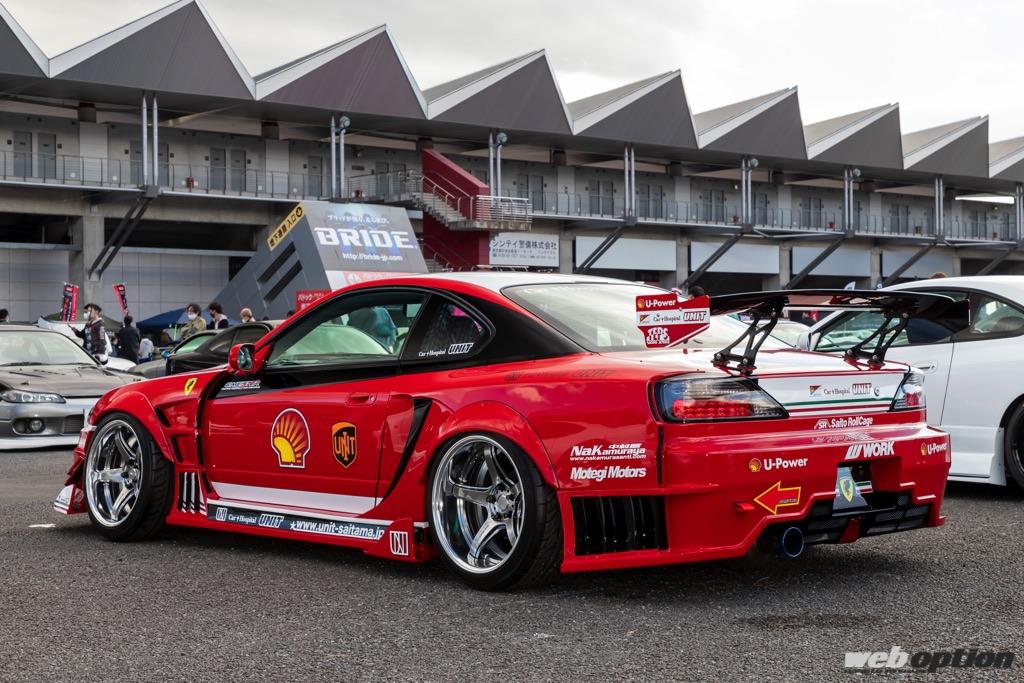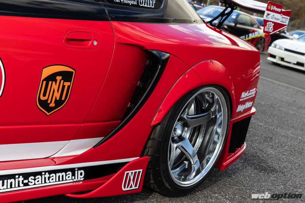 製作者は“カーホスピタルユニット”という鈑金ショップを経営し、D1ライツシリーズでもJZX100チェイサーを駆って活躍している内山竜司選手。彼は大のF1好きで、約5年前に次期競技マシン用として購入したS15をコツコツと仕上げてきたという。