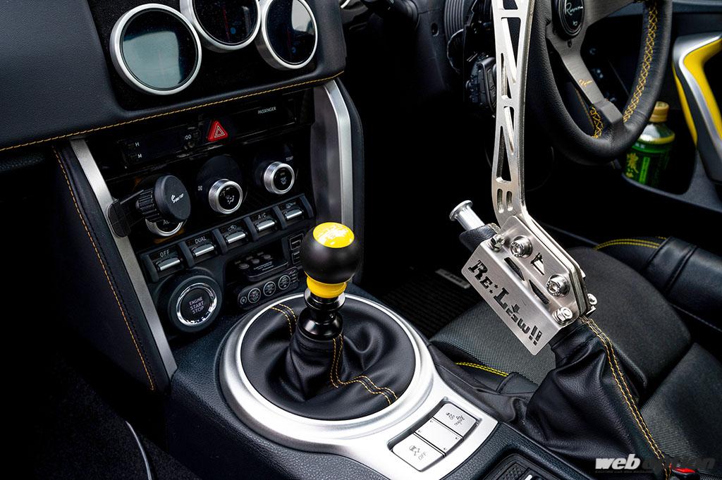 イエローの差し色が特徴的なイエローディションならではのインテリアには、3連メーターとRE:LOW!!製サイドブレーキアダプターを導入。こちらはジムカーナにチャレンジしていた友人から譲ってもらったパーツとのこと。