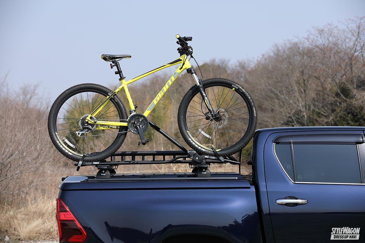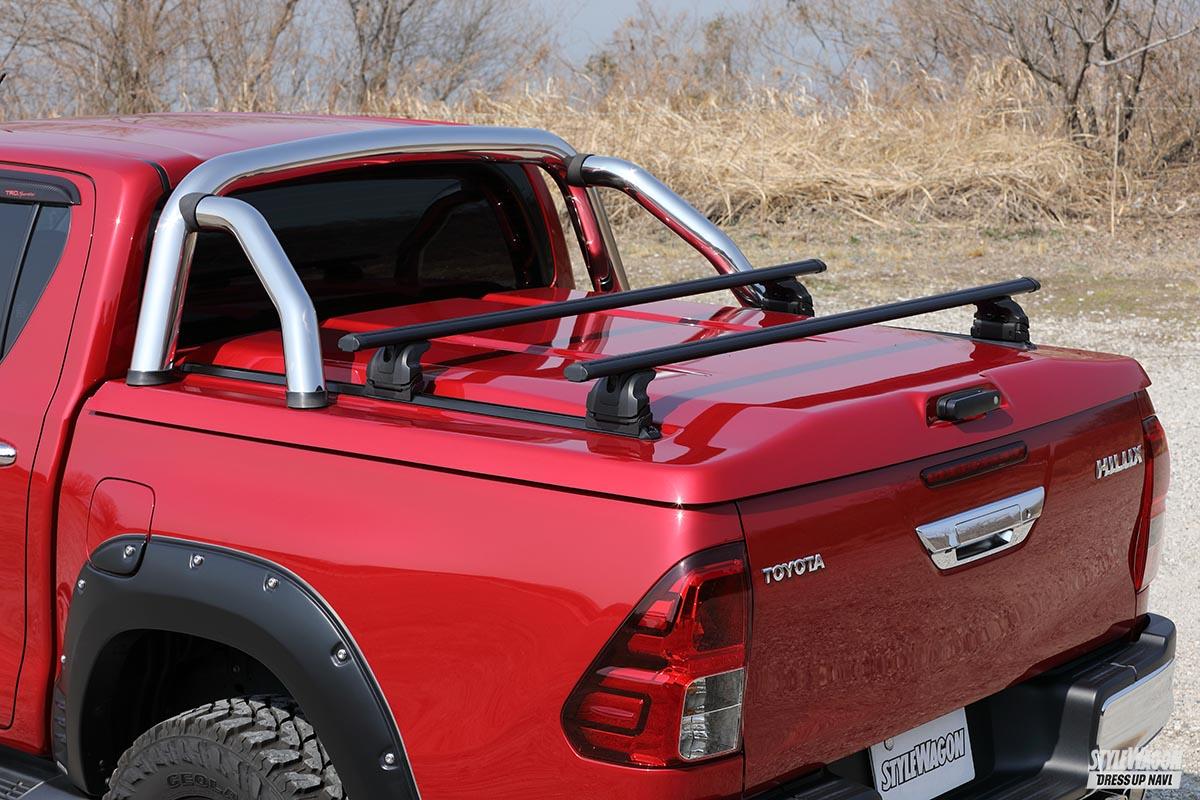 トノカバーの上に装備されたレールにアダプターとバーを装着することで市販のキャリアやラックを搭載することができる。スノーキャリアやバイクキャリアのほか、ルーフラックを装着するなどトノカバーの利便性を拡張できるのだ。