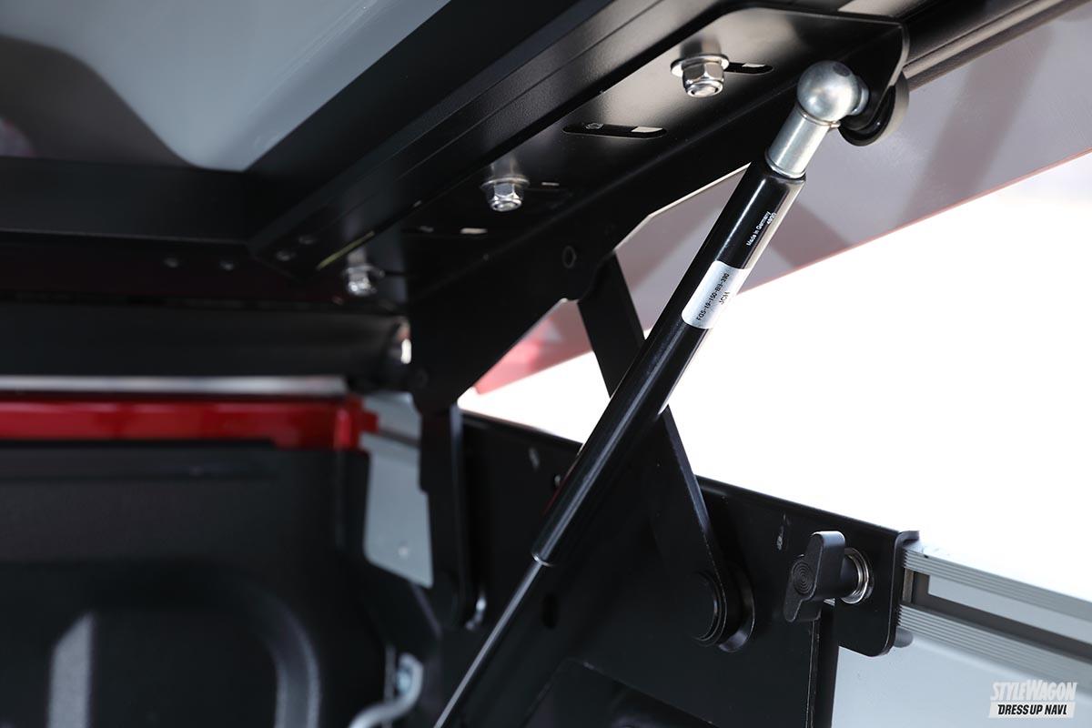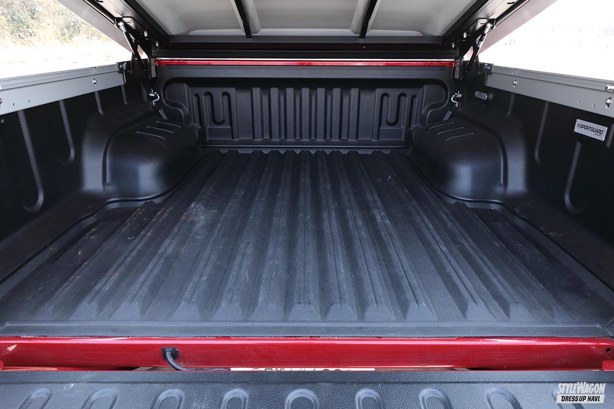 スポーツリッドV最大の特徴は内部にアルミフレームが入っていること。そのため、ルーフキャリアやバイクキャリアなどを「トノカバーの上」に装着できるのだ。耐荷重はクローズ状態で75㎏、オープン時でも20㎏の積載が可能となるので、キャンプ道具などを積むことも可能。止水性も極めて優れており台風時に高速を走っても水の浸入がなかったほど。カラーはボディ純正色とワイルドな質感のブラックテクスチャーをラインアップする。いっぽうデッキには分割式のスポーツガードⅡと、一体式のベッドライナーを用意してデッキを保護してくれるぞ。
