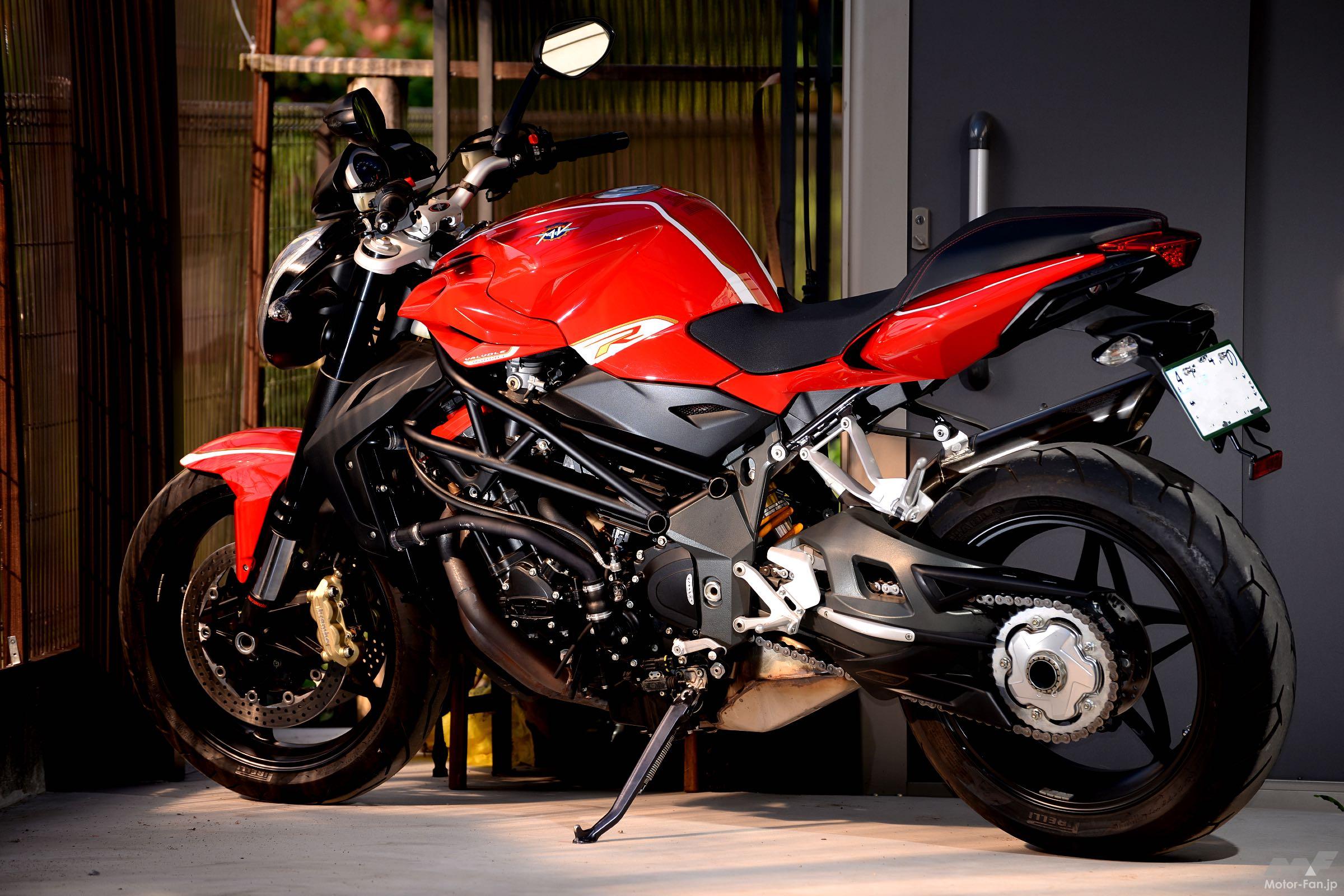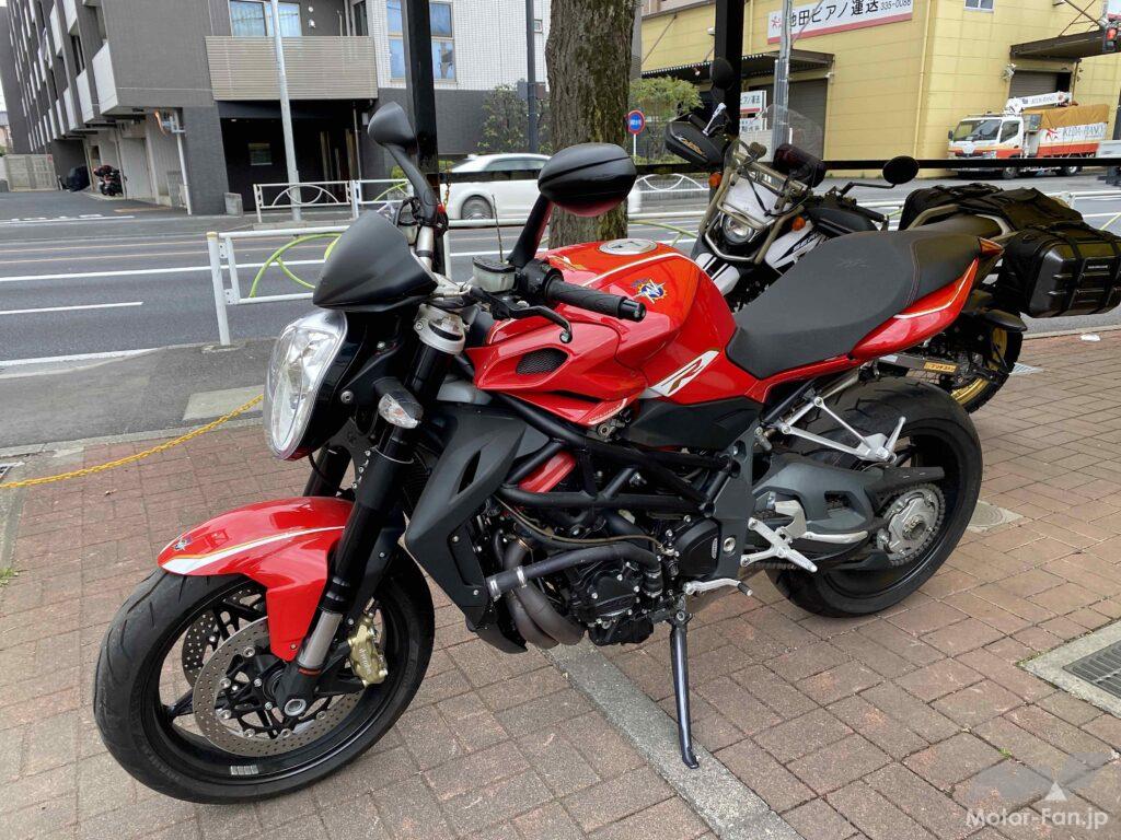 モヤモヤしていた頃、この記事のために東京の調布市へ取材に向かった。無事に取材を終え編集部の山田と軽く打ち合わせた後、次の打ち合わせまで2時間ほど間がある。さて、どうしたものかとスマホで地図アプリを開くと、目と鼻の先にレッドバロン府中店がある。時間潰しに行ってみて、V7が置いてあればラッキー!と向かってみたがそんなムシの良い話があるわけない。ガッカリしたまま店舗から出て何気なく店の外に並んだバイクたちを眺めると、一番奥に赤いスタイリッシュなバイクがある。「ブルターレかな」と近づくと予想は的中。ちょっと前のモデルだが、久しぶりに見るとカッコいい!