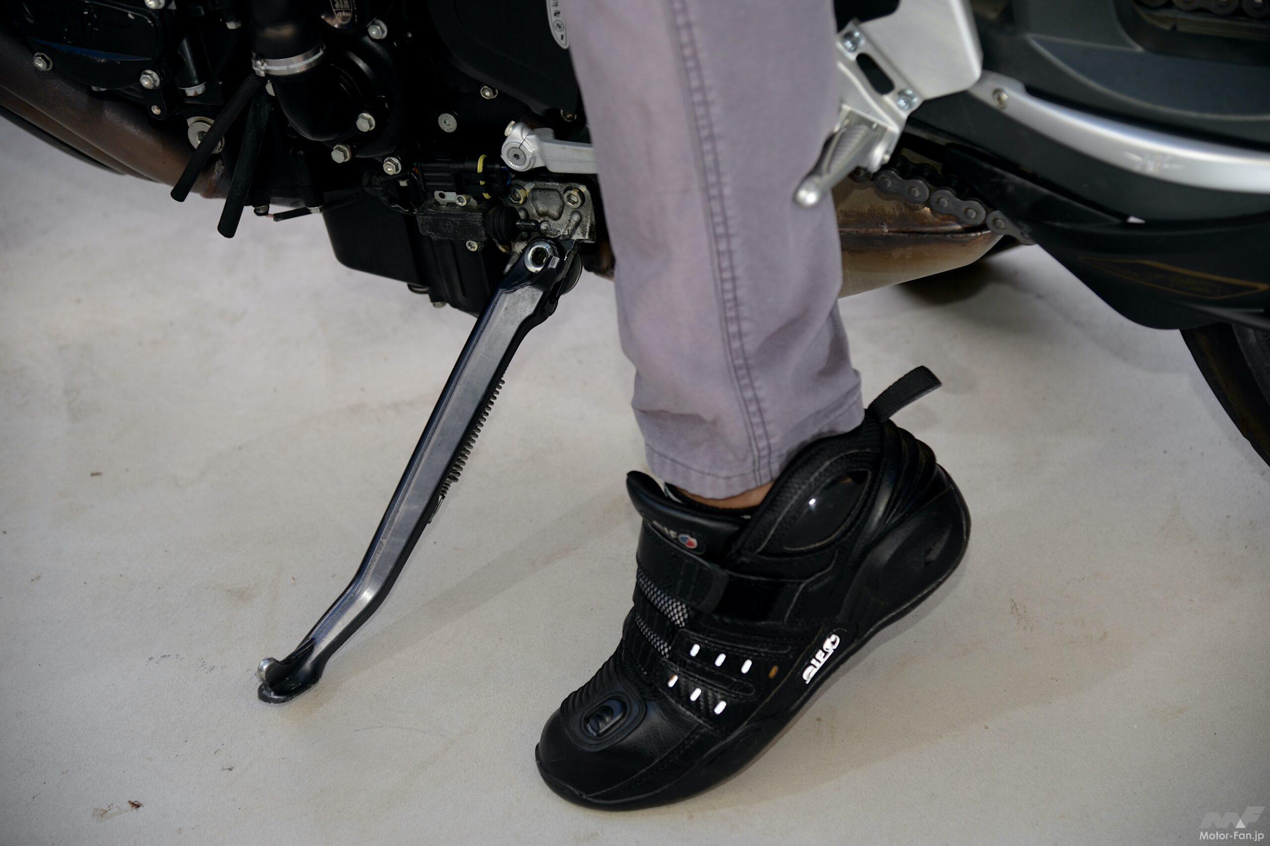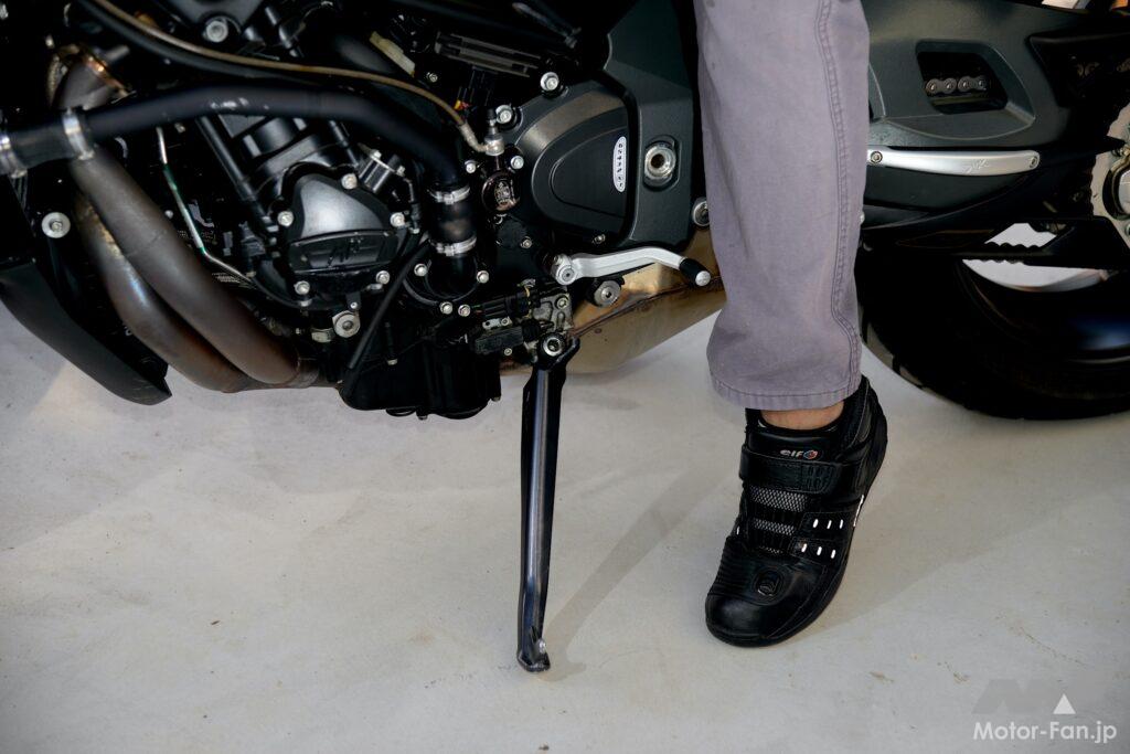 気を取り直して再スタートすると、今度はなんとか発進できた。恐る恐る街中を抜け自宅へと走らせるけれど、なぜこんなことになったのか反芻してみた。ここでもう一度、前回跨った状況を思い出すと記事にもあるよう、当時はビブラムソールのダナー製ブーツを履いていた。ところが納車時は底の薄いライディングシューズだったため、ブーツが足つきを助けていたのだと思い知る。帰路の途中でガソリンスタンドへ寄ったのだが、停車してサイドスタンドを出すまで全く気が抜けなかった。情けないことに帰宅後しばらくして店員さんから「大丈夫でしたか」と電話までいただいてしまった。