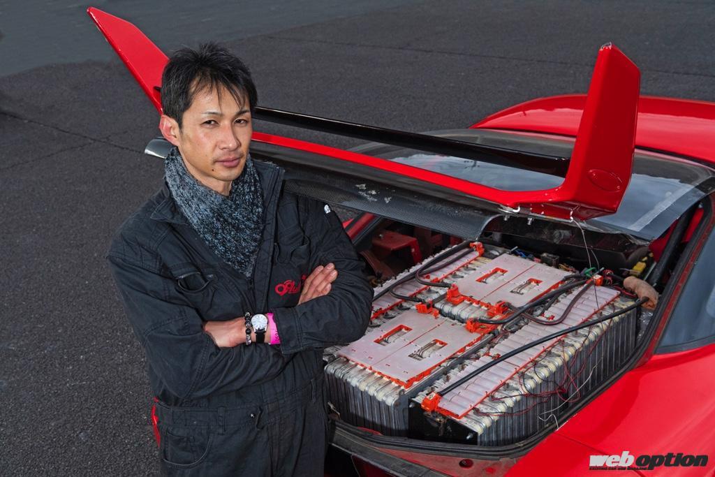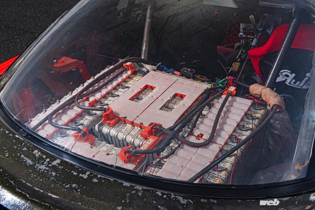 バッテリーは先代リーフ後期用のリチウムイオンを1.6台分ほどハッチバック内にインストール。40個のセルをまとめたものが2セット積み込まれ、フル稼働時には瞬間的に300kw、つまり400ps相当のパワーを出力する。最高回転は5500rpm、現状は常時200ps相当の仕様で走っている状態だ。