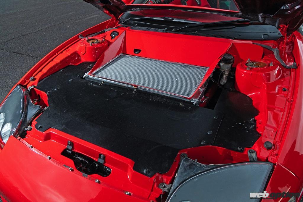 細部を見ていく。モーターはブラシ付きDC、正確には交流でも直流でも回せる交流整流子モーター(ユニバーサルモーター)を使用。エンジンルーム内にうまく収まらなかったこともあり、フロントメンバーを撤去して積み込んだ。モーターを冷却するためのラジエターは水平マウント化され、その作り込みはかなり本格的だ。