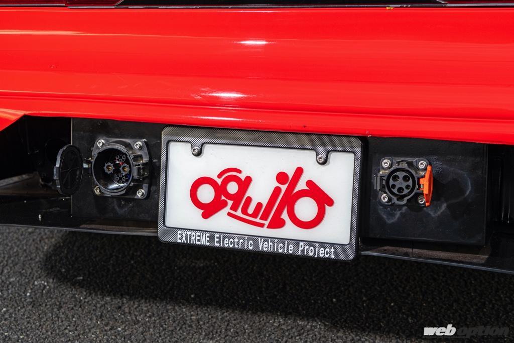 給電用コネクターはバンパー下に設置される。左が急速充電用で、右が通常時の充電用だ。燃料タンクは取り払われており、当然ながらエキゾーストマフラーはなし。