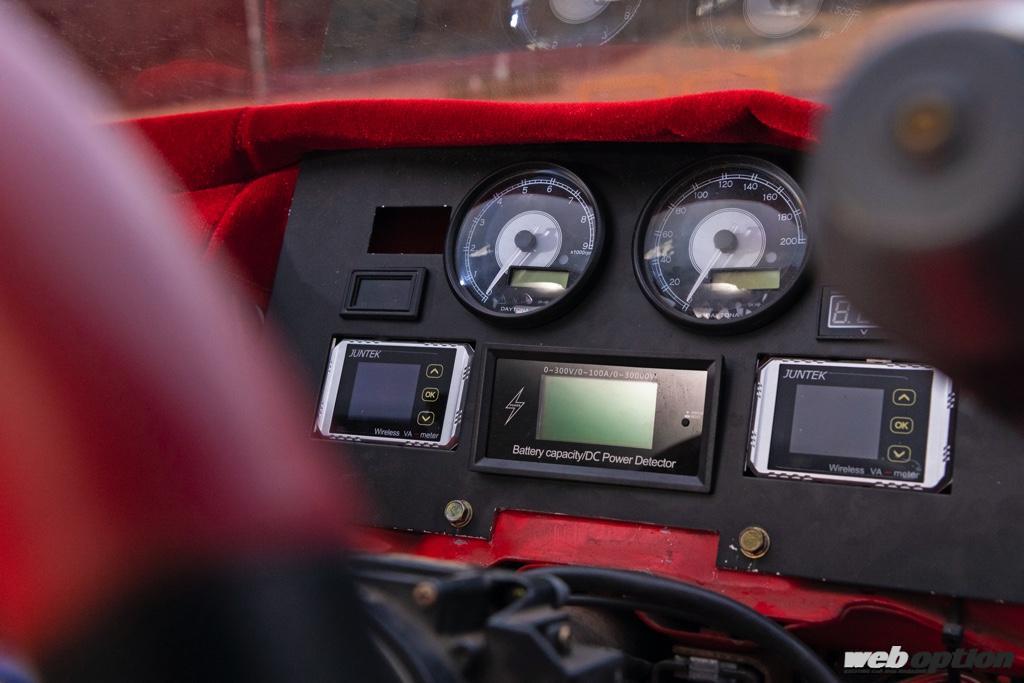 コクピットには電圧や電流を確認するためのメーターを設置。自作のセンターコンソールにはアンドロイド端末がセットされ、トラックボールでのコントロールが可能だ。