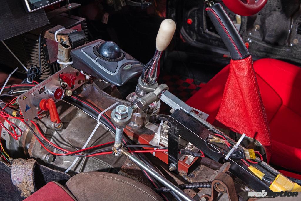 ミッションはしばらく純正の4速直結だったがどうしても加速が鈍かったため、シルビア純正の71Cに変更。加速フィールは段違いで良くなったそうだ。モーターとミッションを積むために切断されたフロアトンネルが苦労の跡を感じさせる。