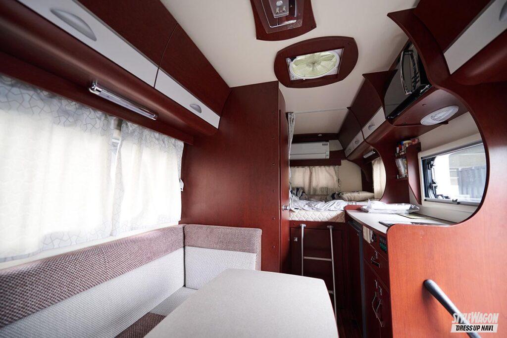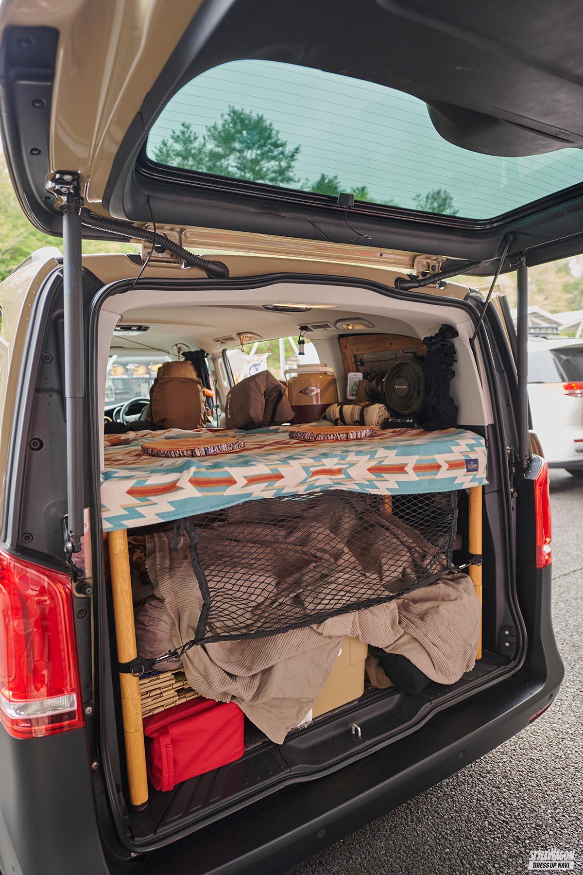 SPECIFICATIONS ■ホイール/W211純正マットブラック塗装(17×8.0+38) ■タイヤ/グッドイヤー(215/60) ■エクステリア/グリル・フェンダー=マットブラック塗装、ルーフレール=ロング用加工 ■インテリア/シートカバー=ゴードンミラー ■その他パーツ/窓枠ウッド・ベッド兼テーブル=自作 他