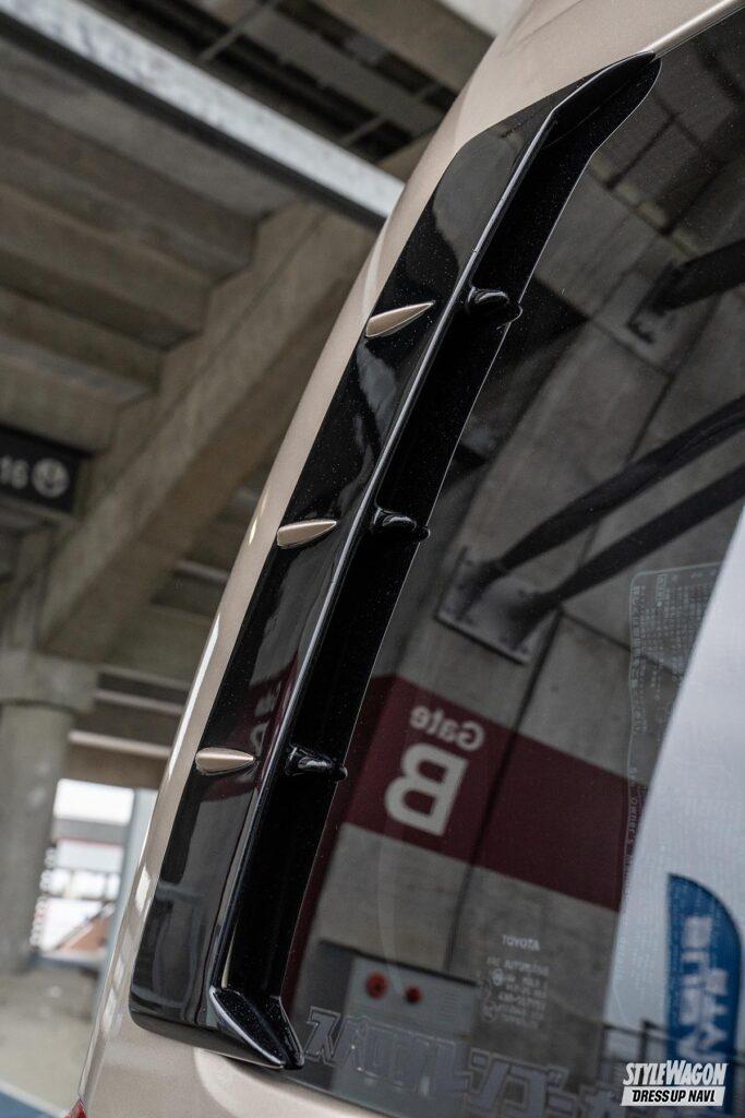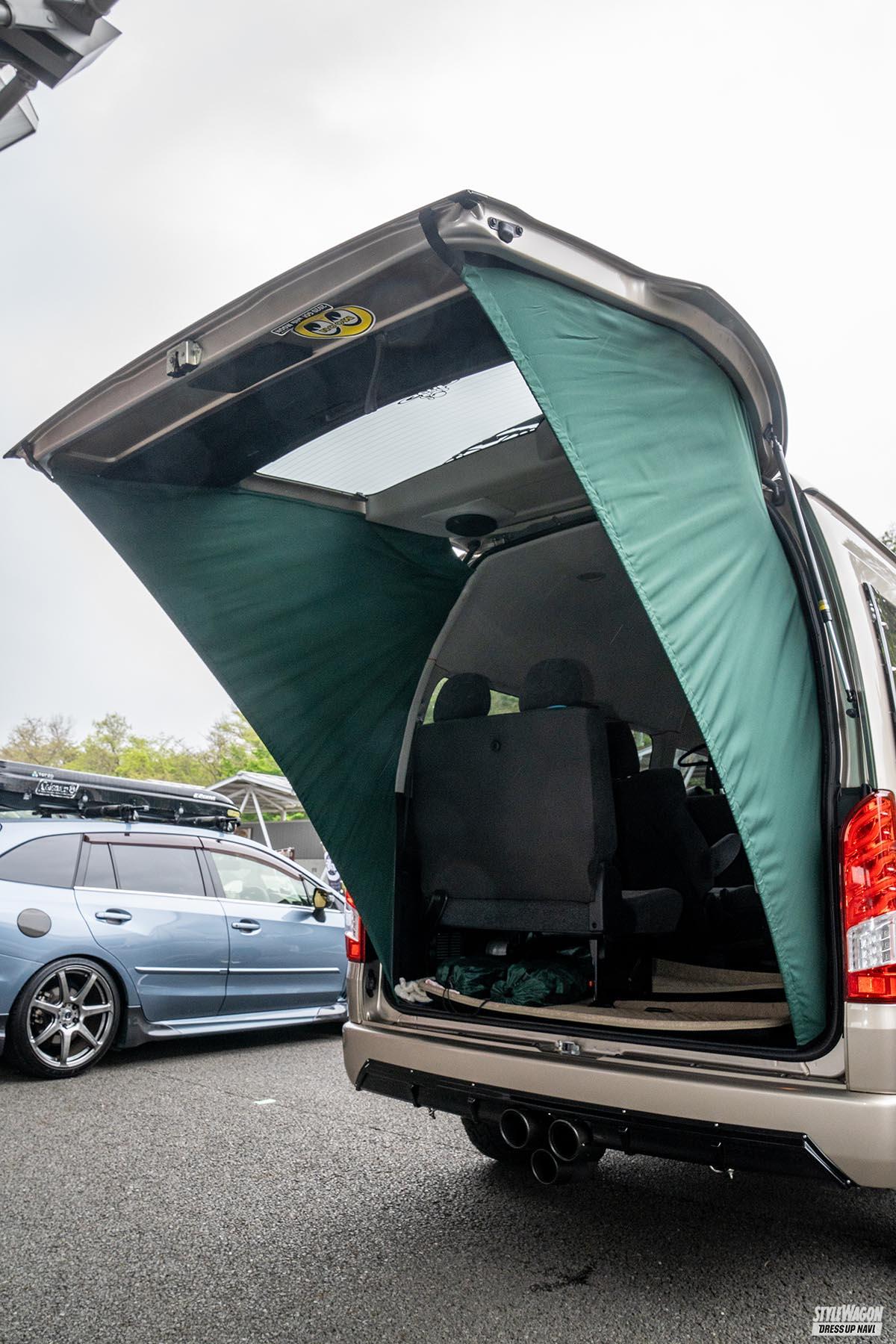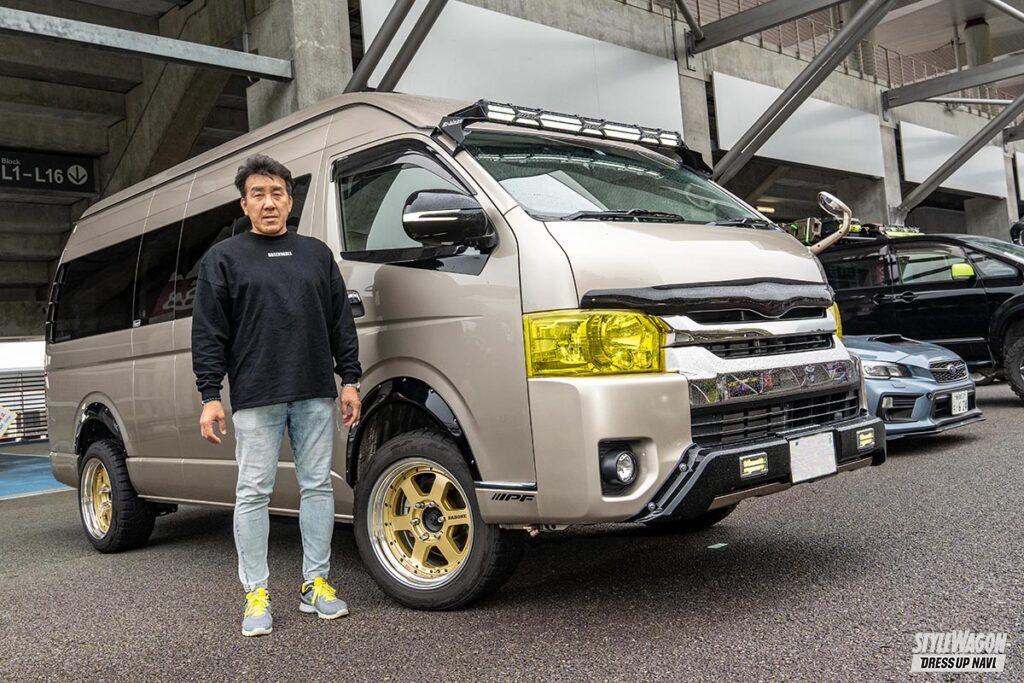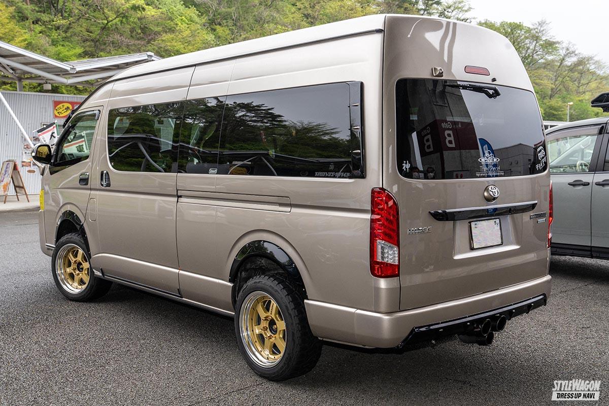 「スノーボードにも行くので四駆ベースのリフトアップに行き着いたんですが、ラグジュアリー感も出したかったんです」とGod hiaceさん。レーシーなデザインとゴールドメタリックのカラーが存在感を放つファブレスRS-6は大満足のチョイスとなったそうだ。車高は1BOX NETWORKのスプリングとランチョのショックの組み合わせで2インチアップ。ボディにフレームサポートセットを取り付けて安定感のある走りも実現している。