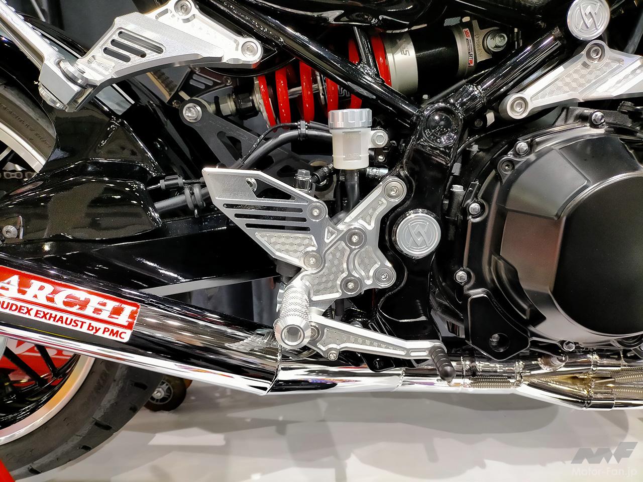 ビレット・ハニカム バックステップキットver.2、ビレット・ハニカム タンデムブラケット、リアマスターシリンダーキャップ、エンジンマウントなどのアルミ削り出しパーツでカスタマイズ。