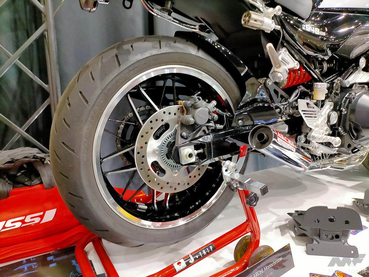 YSS製リアショックに変更。各部にアルミ削り出しパーツやカーボンパーツを導入し、存在感とカスタム度をアップ。