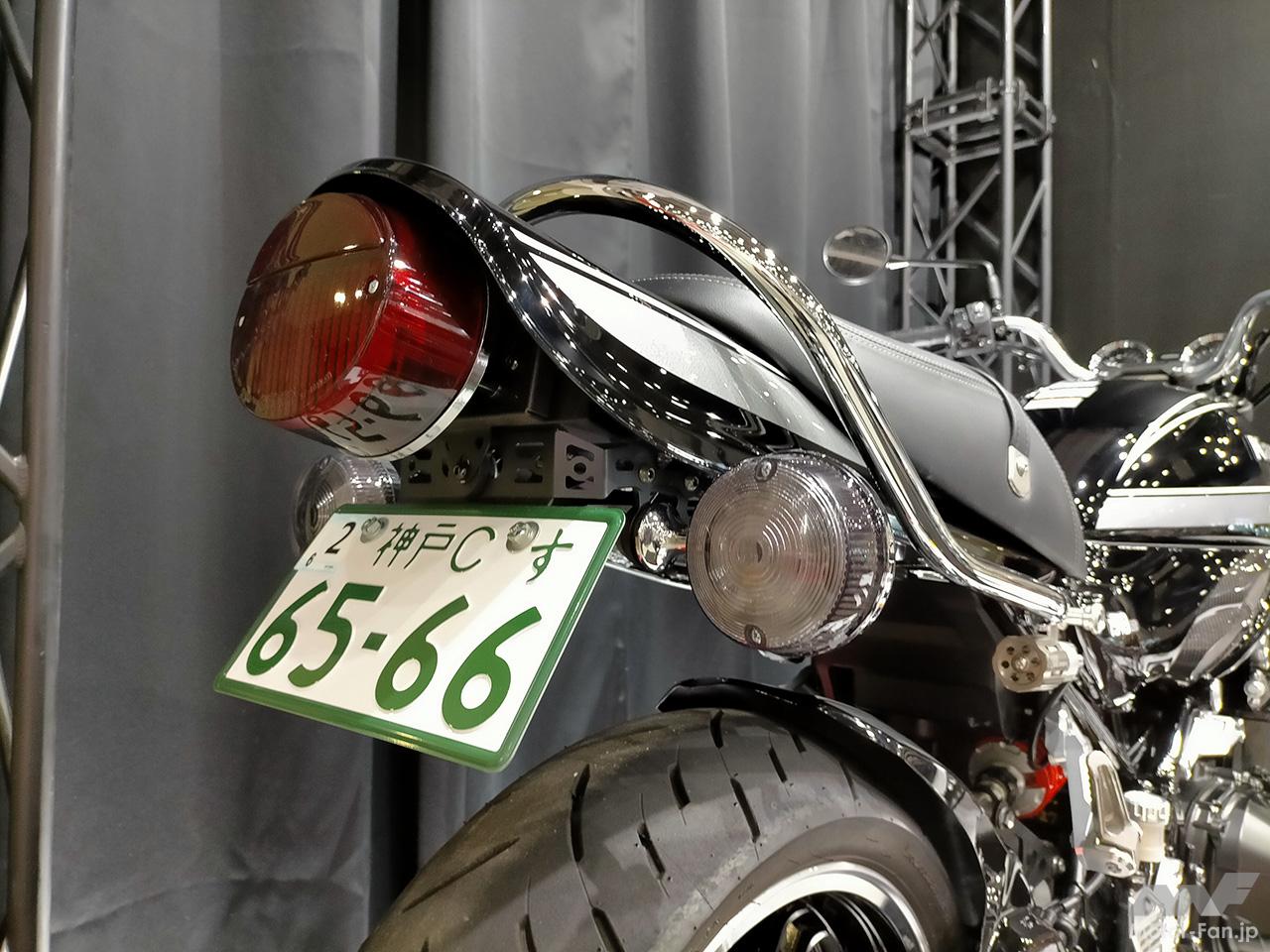 ロングテールカウル、Z2タイプLEDウィンカーセット、ライトスモークウインカーレンズ、Z2タイプLEDテールランプ、タンデムグラブバー、アイアンフェンダーレスキット、FRPリアフェンダーを組み合わせたリア周り。
